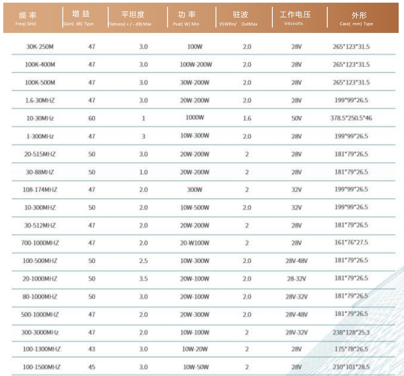 产品分别100KHz~14000MHz频带有数十种射频功放产品,产品包括100K-400MHz;2~30MHz、30-88MHz、88~108MHz、108~225MHz;108~400MHz;30~512MHz;500-1000MHz频段线性功率为20W、50W、100W、200W、500W;超宽带系列1-1000MHz;20-1000MHz;80-1000MHz;1000-2000MHz;500-2700MHz;1000-3000MHz;2500-6000MHz;5700-5900MHz;分功率为10W、20W、50W、100W、200W;